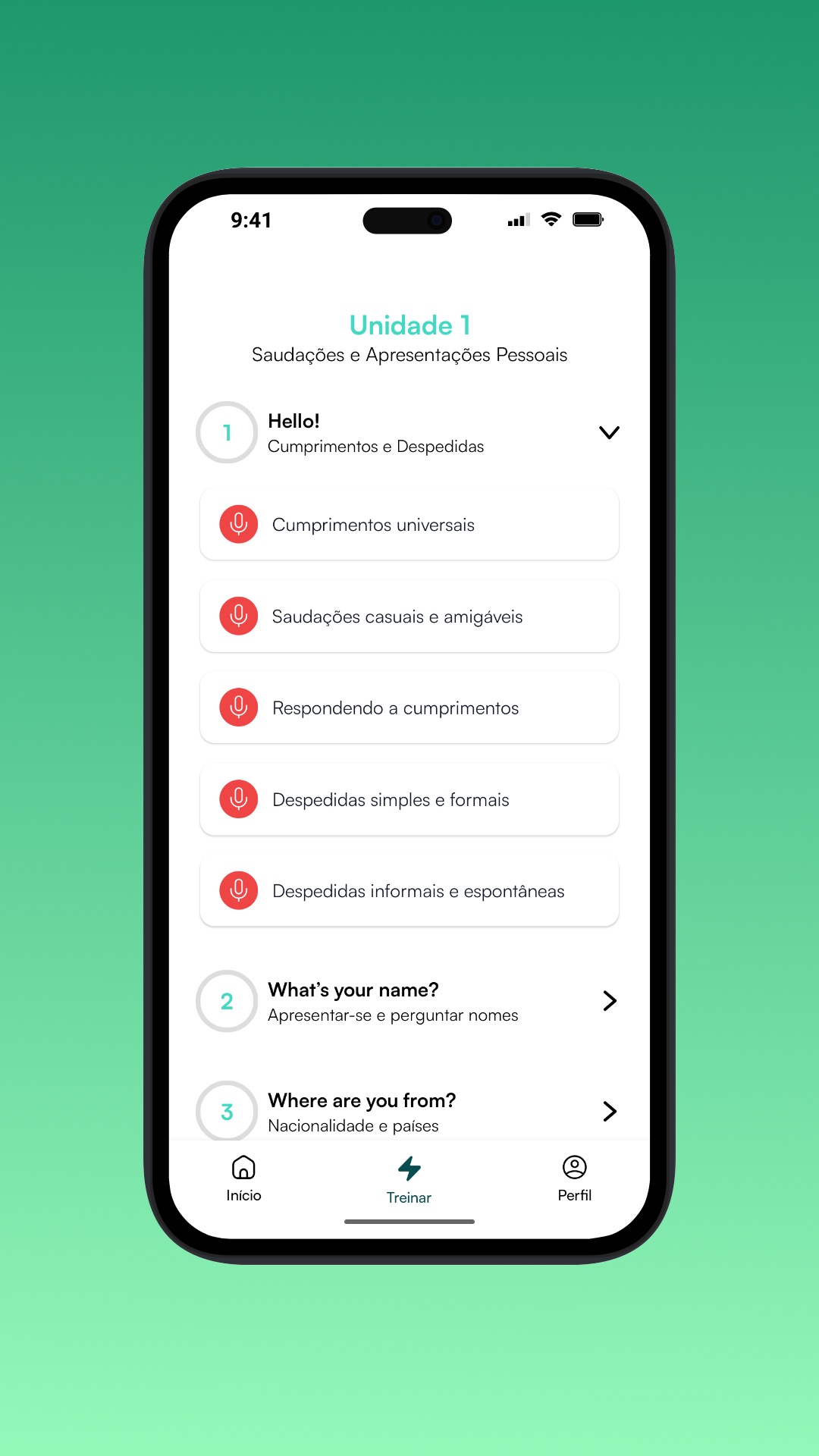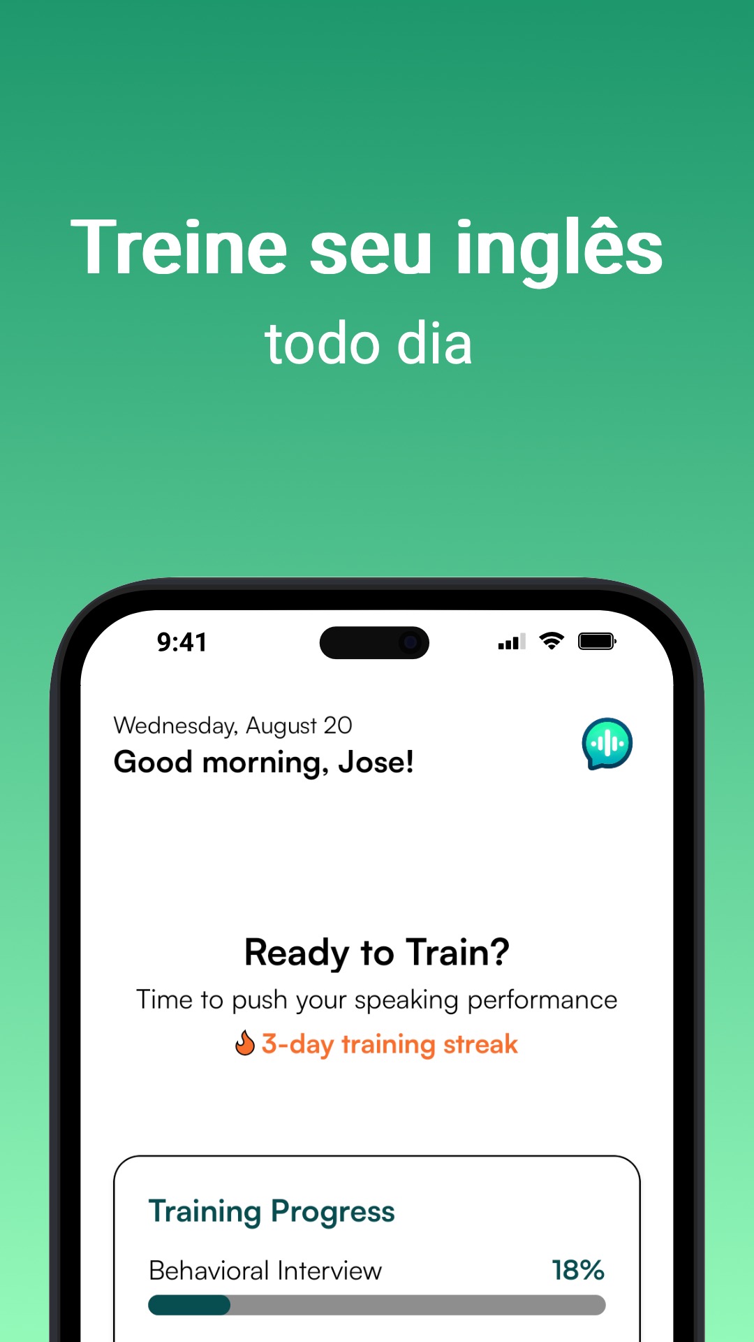 Treino guiado, frases em trilha e feedback claro — tudo no seu celular.